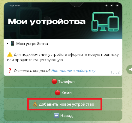 Перейдите в Telegram-бот, запустите Trust VPN и нажмите «Подключить VPN».