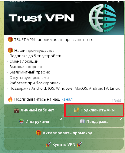 Trust VPN — это современный VPN-сервис, который работает через Telegram-бота.